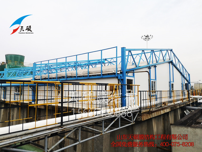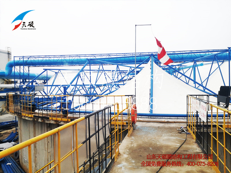 1.廢氣收集效果好;污水池膜加蓋是一種新型的廢氣收集裝置,將膜材作為蓋板,污水池四周用鋼架支撐,將膜材反吊在污水池上,通過池內(nèi)廢氣處理裝置的作用,將廢氣凈化之后,排出池外,廢氣收集效果好;